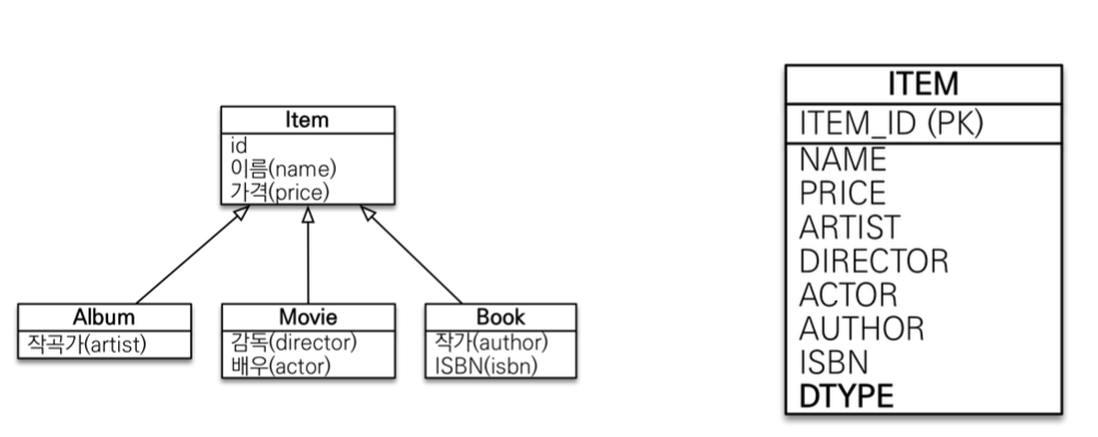 - κ°κ°μ μλΈνμ μ 보λ₯Ό ꡬλΆνκΈ° μν κ΅¬λΆ μ»¬λΌ(μμ κ·Έλ¦Όμμ ITEM ν μ΄λΈμ DTYPE)μ΄ νμνλ€.