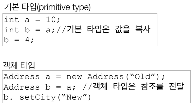 - μ΄μ λ¬λ¦¬ μλ² λλ νμ μ²λΌ μ§μ μ μν κ° νμ μ μλ°μ κΈ°λ³Έ νμ μ΄ μλλΌ κ°μ²΄ νμ μ΄λ―λ‘ μλ° κΈ°λ³Έ νμ μ²λΌ μλμΌλ‘ κ°μ 볡μ¬νμ¬ μ¬μ©νλ κ²μ΄ μλλ―λ‘, 곡μ μ°Έμ‘°λ₯Ό λ§μ λ°©λ²μ΄ μλ€.