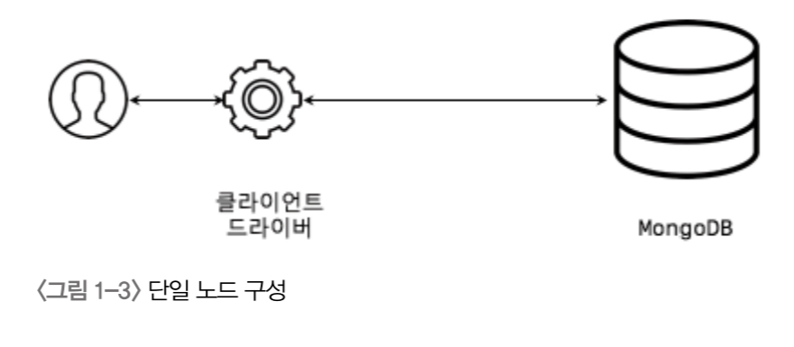 - 위와 같은 단일 노드 구성에서는 응용 프로그램의 MongoDB 드라이버가 MongoDB 서버에 직접 연결하게 되며, 별도의 레플리카 셋을 가지지 않으므로 MongoDB 서버가 응답 불능 상태라 하더라도 자동 fail-over 및 HA 기능이 작동할 수 없음