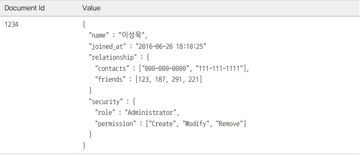 - 스키마를 별도로 정의하지 않는 DBMS이므로, 필드에 대한 정보는 모두 각각의 데이터(document)에 사용자 데이터와 함께 저장됨