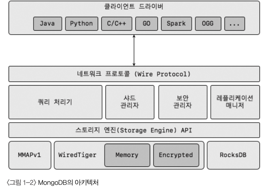 - 응용 프로그램은 각 프로그래밍 언어별로 적절한 클라이언트 드라이버를 이용해 MongoDB 서버와 통신함
