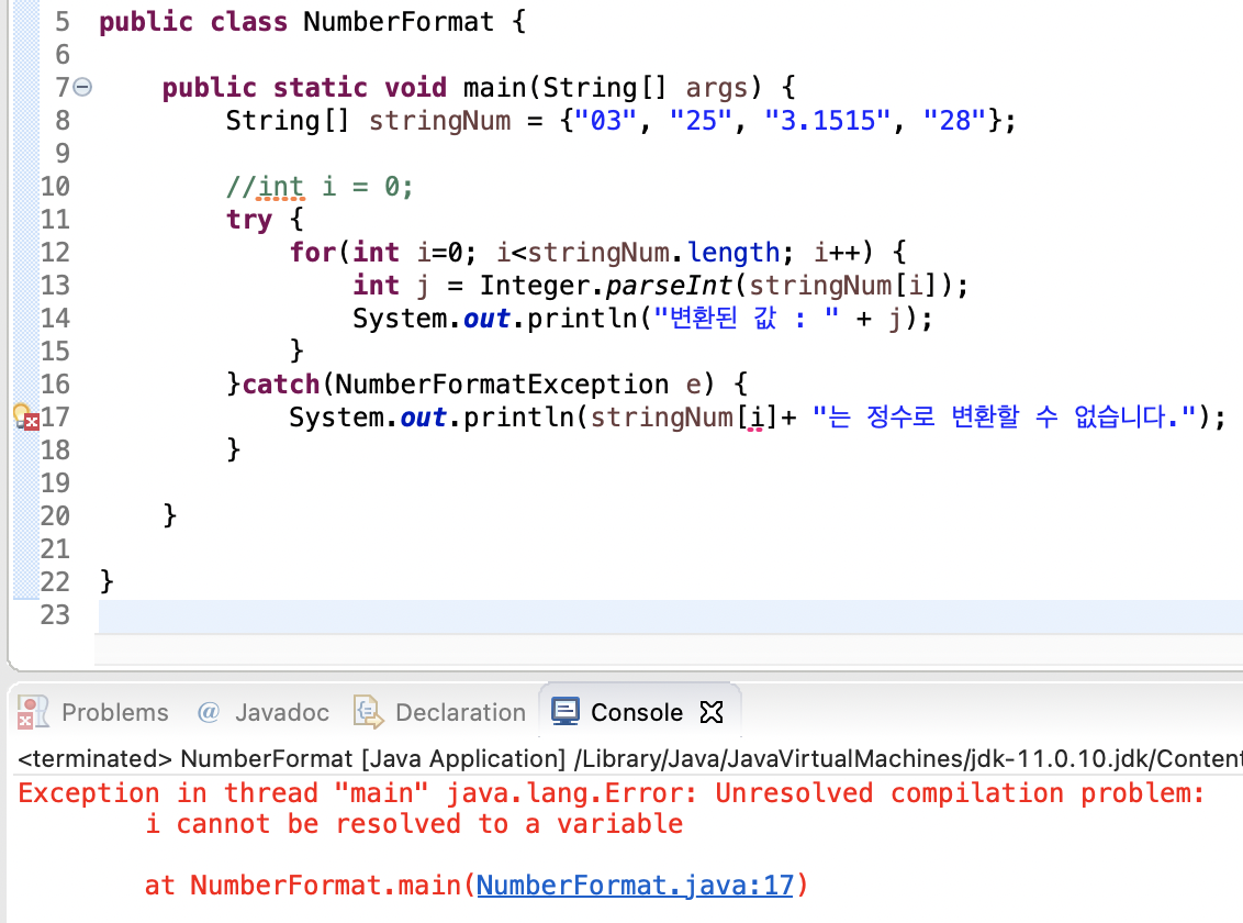 int i = 0; //catch블록에서 i 값 사용하기 위해 try 블록 밖에서 선언해줌
