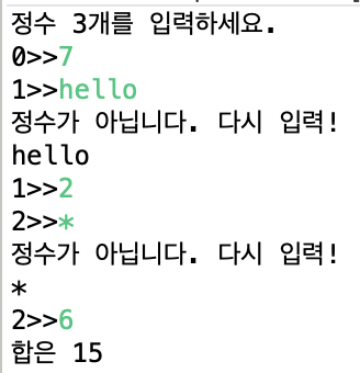 System.out.println("정수가 아닙니다. 다시 입력!");