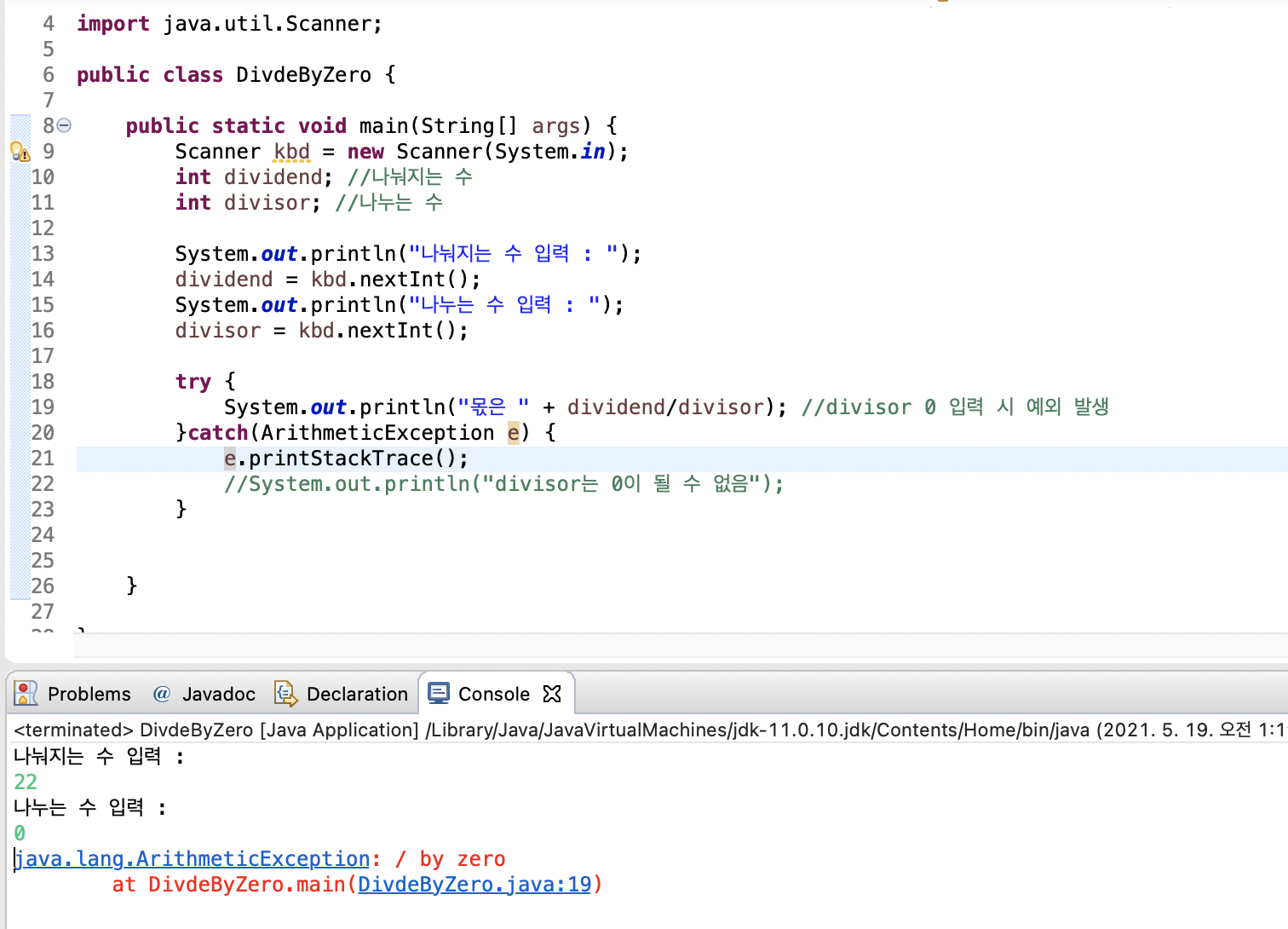 System.out.println("몫은 " + dividend/divisor); //divisor 0 입력 시 예외 발생