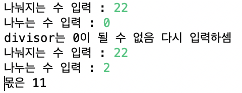 System.out.println("divisor는 0이 될 수 없음 다시 입력하셈");