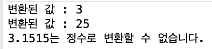 4. 실행 예외 : 정수가 아닌 문자열을 정수로 변환할 때 --> NumberFormatException 발생