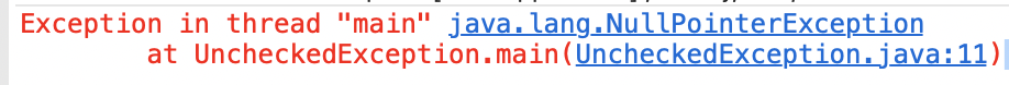--> Checked Exception과 달리 NullPointerException에 대한 예외 처리를 하지 않았음에도 컴파일이 되고 실행됨
