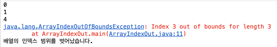 System.out.println("배열의 인덱스 범위를 벗어났습니다.");