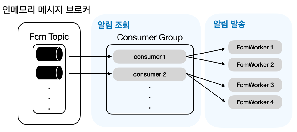 - 알림 생성 API 호출 시 알림 요청 처리 로직에서 1) 알림 메시지 저장, 2) 인메모리 메시지 브로커에 메시지 전달하면, 인메모리 메시지 브로커는 해당 Topic의 인메모리 큐에 메시지 저장