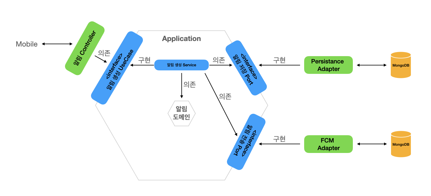 - 위와 같은 구조를 바탕으로 이후 알림 서비스 구조 개선 시 비즈니스 로직은 변경하지 않으면서 데이터베이스 등과 같은 외부 시스템에 의존하지 않고 쉽게 기능 및 구성을 확장할 수 있을 것이라고 생각함