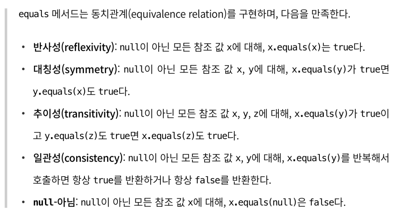 - ๊ฐ์ฒด ์๋ณ์ฑ(object identity : ๋ ๊ฐ์ฒด๊ฐ ๋ฌผ๋ฆฌ์ ์ผ๋ก ๊ฐ์๊ฐ)์ด ์๋๋ผ ๋ ผ๋ฆฌ์ ๋์น์ฑ์ ํ์ธํด์ผ ํ๋๋ฐ, ์์ ํด๋์ค์ equals๊ฐ ๋ ผ๋ฆฌ์ ๋์น์ฑ์ ๋น๊ตํ๋๋ก ์ฌ์ ์๋์ง ์์์ ๋๋ฅผ ์๋ฏธํจ