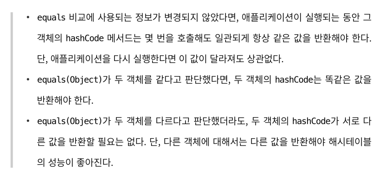 - equals๋ฅผ ์ฌ์ ์ํ ํด๋์ค ๋ชจ๋์์ hashCode๋ ์ฌ์ ์ํด์ผ ํจ