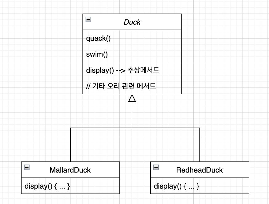 3) 인스턴스 변수 설정 public class MallardDuck extends Duck { public MallardDuck() { quackBehavior = new Quack(); // 꽥꽥거리는 행동을 Quack 객체에 위임 flyBehavior = new FlyWithWings(); // 나는 행동을 FlyWithWings 객체에 위임 } public void display() { System.out.println("안녕 난 물오리"); } }- MallardDuck의 생성자에서 Duck으로부터 상속받은 quackBehavior 인스턴스 변수에 Quack(QuackBehavior 구현체) 형식의 새로운 인스턴스를 대입함 (flyBehavior도 동일)