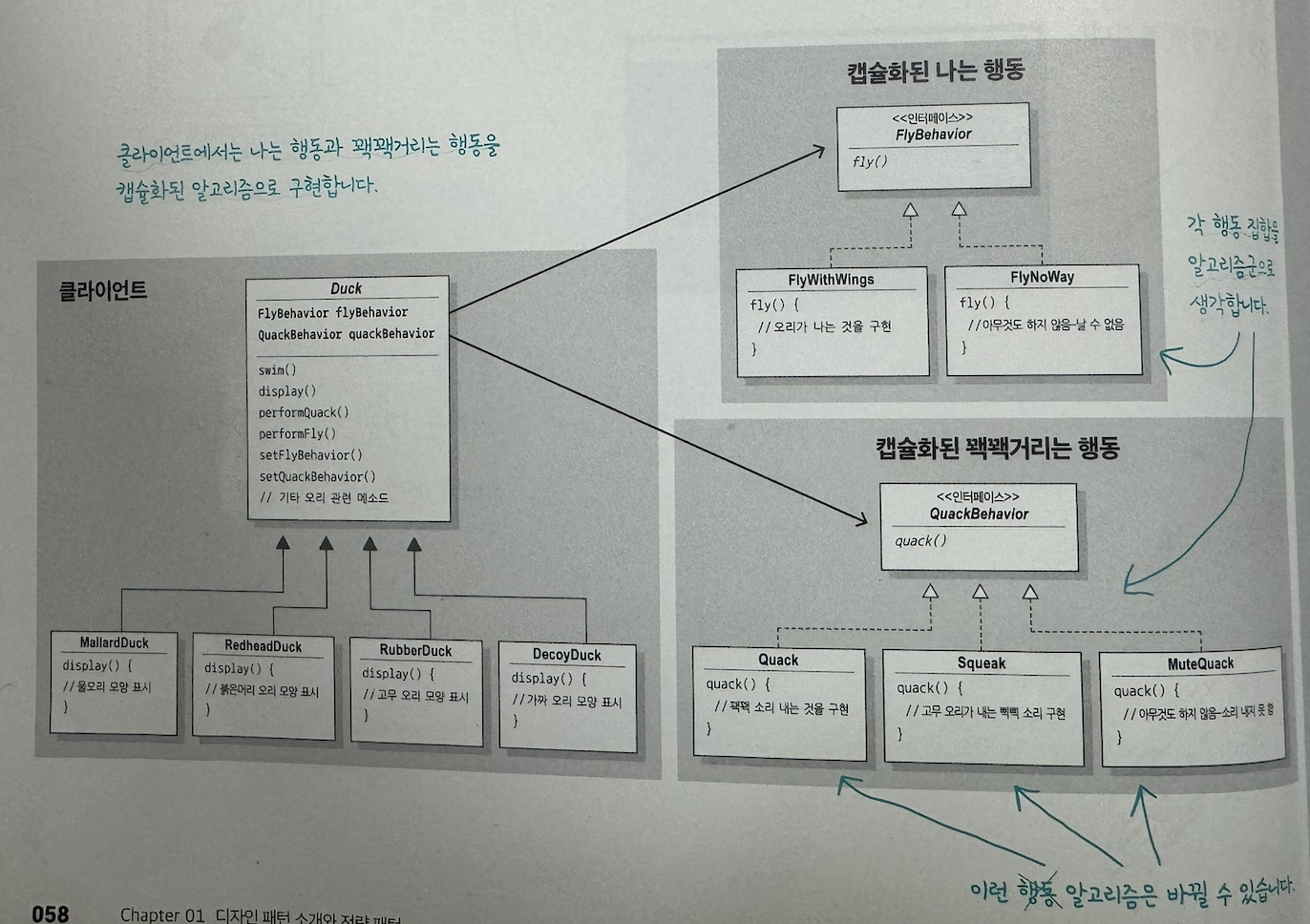 이제 정리해보자! ## 캡슐화된 행동 살펴보기전체 구조는 다음과 같다.  - 오리들은 모두 Duck을 확장해서 만들고, 나는 행동은 FlyBehavior를, 꽥꽥거리는 행동은 QuackBehavior를 구현해서 만듦