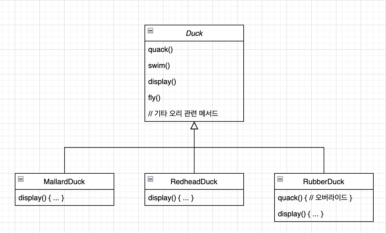 패턴을 잘 사용하려면 패턴을 머릿속에 집어넣은 다음 어플리케이션에 어떻게 적용할지 파악해야 한다. 디자인 패턴은 코드가 아닌 경험을 재사용하는 것이기 때문이다. ## 예시로 문제 상황 살펴보기매숑이는 오리 시뮬레이션 게임을 만드는 회사에 다니고 있다. 이 게임에는 헤엄도 치고 꽥꽥 소리도 내는 매우 다양한 오리가 등장한다. 이 시스템을 처음 디자인한 사람은 표준 객체지향 기법을 사용해 Duck 이라는 슈퍼클래스를 만든 다음, 그 클래스를 확장해 서로 다른 종류의 오리를 만들었다.  시간이 흘러 오리가 나는 기능을 추가해달라는 요청이 들어왔다. 위의 구조에서 쉽게 떠올리는 방법은 Duck 클래스에 fly()를 추가하는 것이다.  하지만 여기에 조건이 하나 추가되었다. Duck의 몇몇 서브클래스만 날아야 한다는 것이다. 위와 같이 Duck이라는 슈퍼클래스에 fly() 메서드를 추가하면 일부 서브클래스에 적합하지 않은 행동이 추가되게 된다. 어떻게 하면 좋을까..? 상속을 생각해보자!  위와 같이 필요하지 않은 기능은 하위 클래스에서 오버라이드한다. 하지만 상속을 계속 활용한다면 새로운 오리가 추가될 때마다 필요하지 않은 기능들은 모두 오버라이드 해줘야 한다. 그럼 인터페이스를 생각해보자!  위와 같이 fly()와 quack()을 Duck 슈퍼클래스에서 빼고 각각 인터페이스로 만든다. 날 수 있는 오리와 소리낼 수 있는 오리에서만 각 인터페이스를 구현한다. 하지만 해당 기능이 필요한 모든 하위 클래스에서 인터페이스를 구현해야 하므로 코드의 중복이 발생한다. ### 문제 상황 요약- 상황 : 주기적으로 기능이 추가된다. 경우에 따라 해당 기능이 필요할 수도 있고 필요하지 않을 수도 있다.