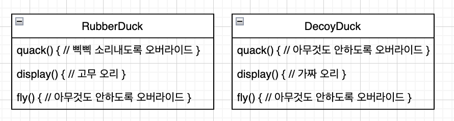 - 위의 오리 클래스에서는 행동을 상속받는 대신, 별도의 객체로 구성된 행동을 부여받음
