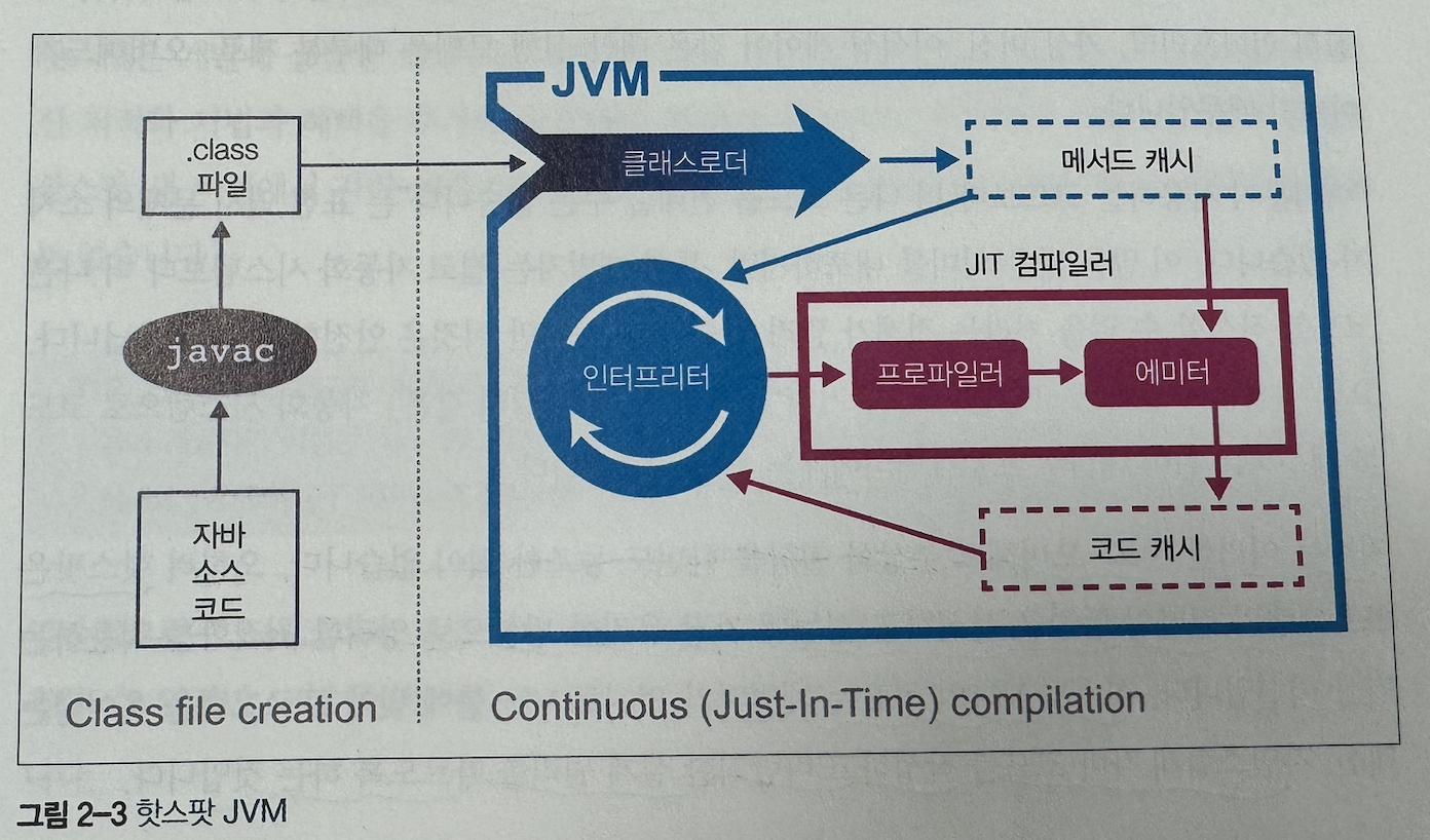 - 핫스팟은 인터프리티드 모드로 실행하는 동안 어플리케이션을 모니터링하며 가장 자주 실행되는 코드 파트를 발견해 JIT 컴파일을 수행함