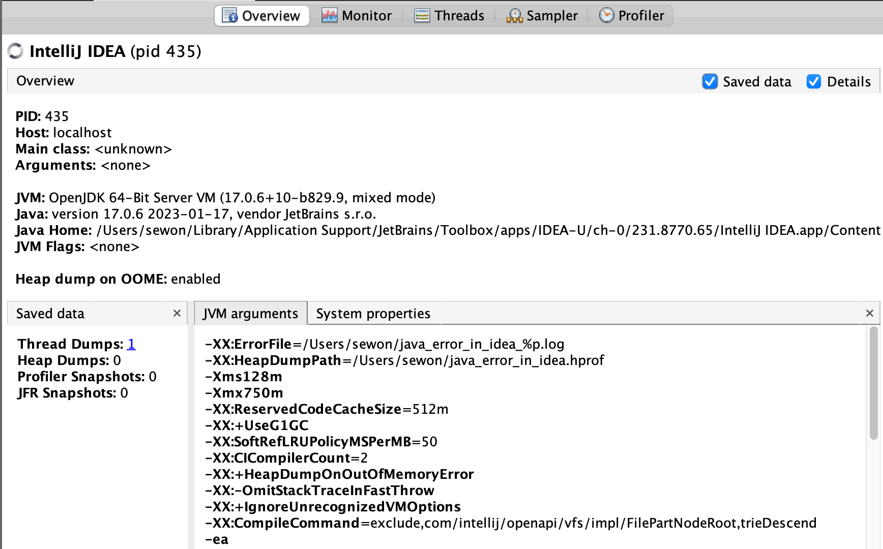 - 프로세스에 전달한 전체 플래그와 시스템 프로퍼티, 실행 중인 자바 버전 제공