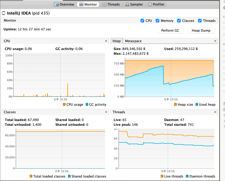 - 로드/언로드 된 클래스 개수 및 실행 중인 스레드 개수 등 현황도 알 수 있음