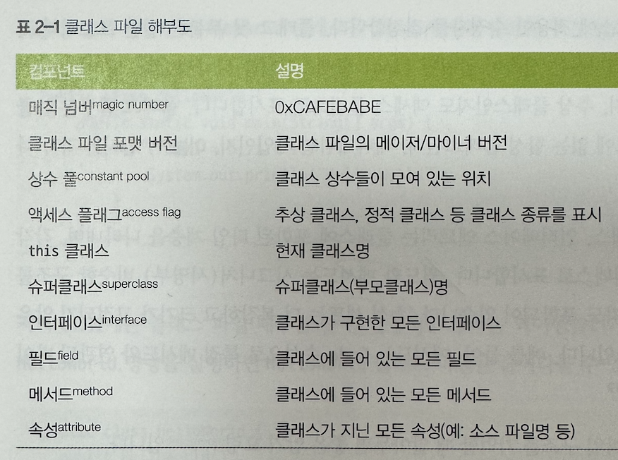 - 모든 클래스 파일은 해당 파일이 클래스 파일(.class)임을 나타내는 4바이트 16진수인 0xCAFEBABE라는 매직 넘버로 시작함