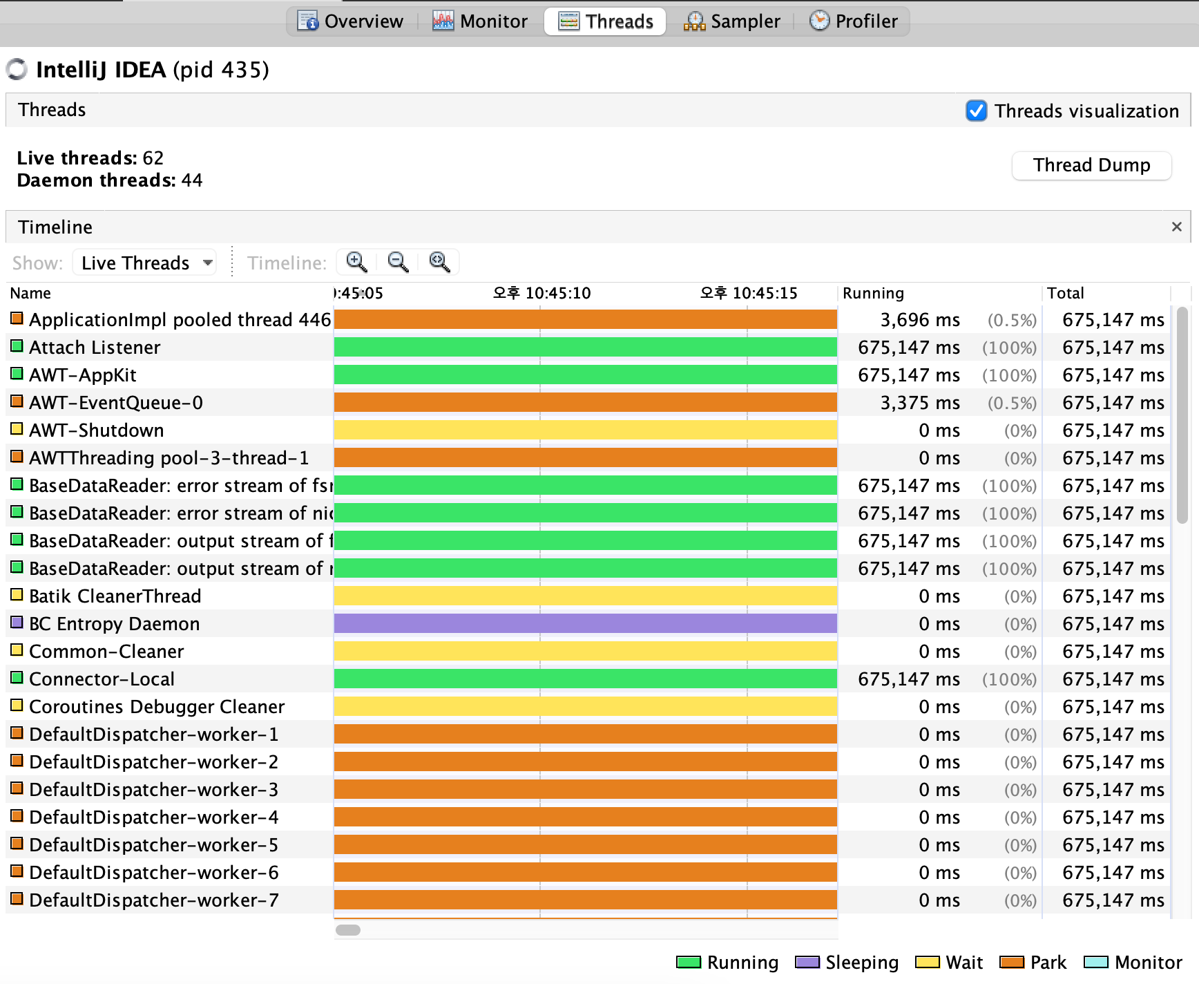- 실행 중인 어플리케이션 각 스레드(어플리케이션 스레드 + VM 스레드)가 시간대별로 표시됨