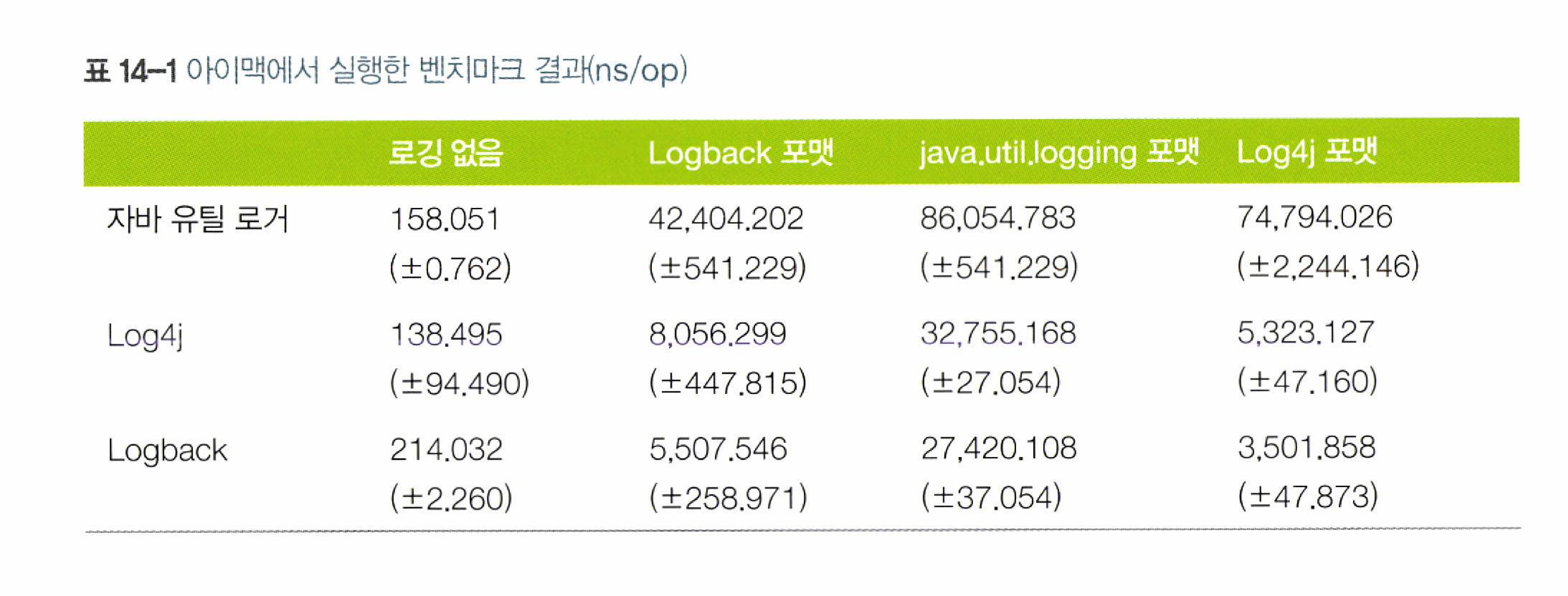 - 로깅 프레임워크가 생성하는 가비지도 잘 따져봐야 함 (로깅하느라 소비한 CPU 시간만큼 핵심 업무를 병렬 처리할 기회를 잃어버리기 때문). 로깅 라이브러리의 설계와 작동 원리 역시 직선적인 마이크로벤치마크 실행 결과만큼 중요함