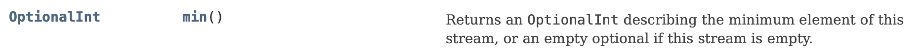 java.util.OptinalInt 클래스의 getAsInt() 메서드 Arrays 클래스의 stream()을 사용해 스트림 형태로 만들어 준 뒤, IntStream 인터페이스의 min() 메서드로 해당 배열의 최소값을 구하고, OptionalInt 클래스의 getAsInt() 메서드로 해당 값을 int 형태로 가져온다.