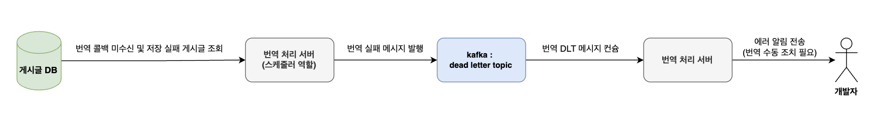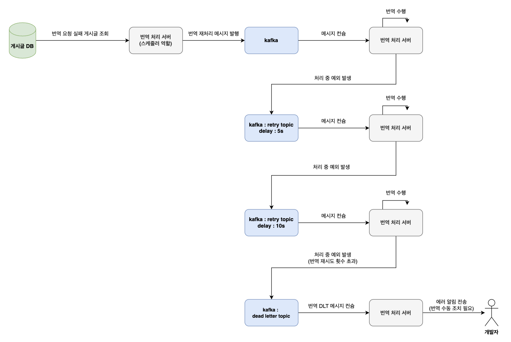 [Kafka Connect] 카프카 커넥트 클러스터 구성 (0) 2025.02.03 [번역 서비스] 로직 구현 시 고민한 부분 (0) 2025.01.30 [번역 서비스] 적용 - Delayed Retry Topic (0) 2025.01.28 [번역 서비스] 개선 - 번역 실패 모니터링 아키텍처 (0) 2025.01.08 [번역 서비스] 번역 시스템 설계 (0) 2024.12.29 - 모든 번역 실패 케이스에 대한 수동 재처리 필요
