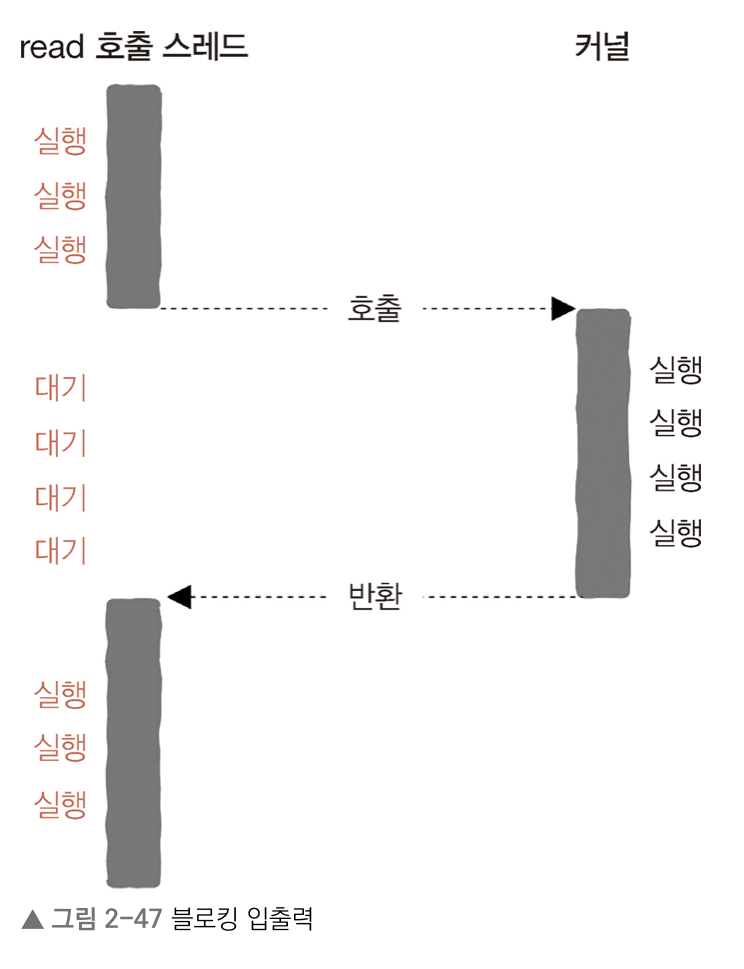 - 운영체제는 파일 읽기 작업을 위해 위와 같이 호출 스레드를 일시 중지시키고, 커널이 디스크 내용을 읽어 오면 일시 중지되었던 스레드가 다시 깨어남