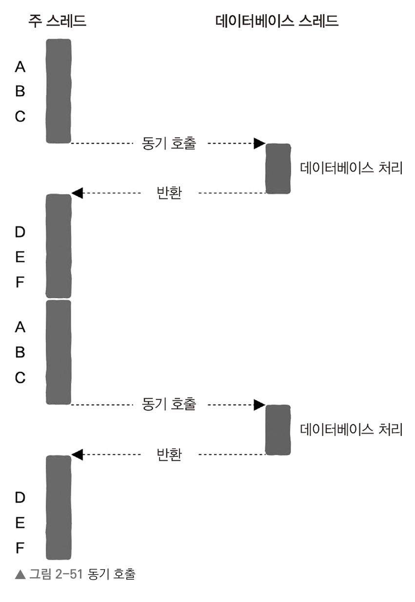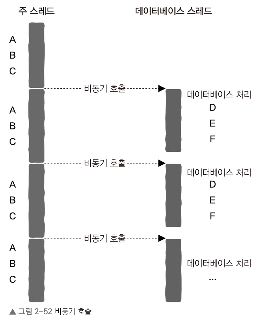 - 데이터베이스 요청 후 주 스레드가 블로킹되어 일시 중지되고, 데이터베이스 처리가 완료된 시점에서 이후 단계인 D, E, F가 실행됨