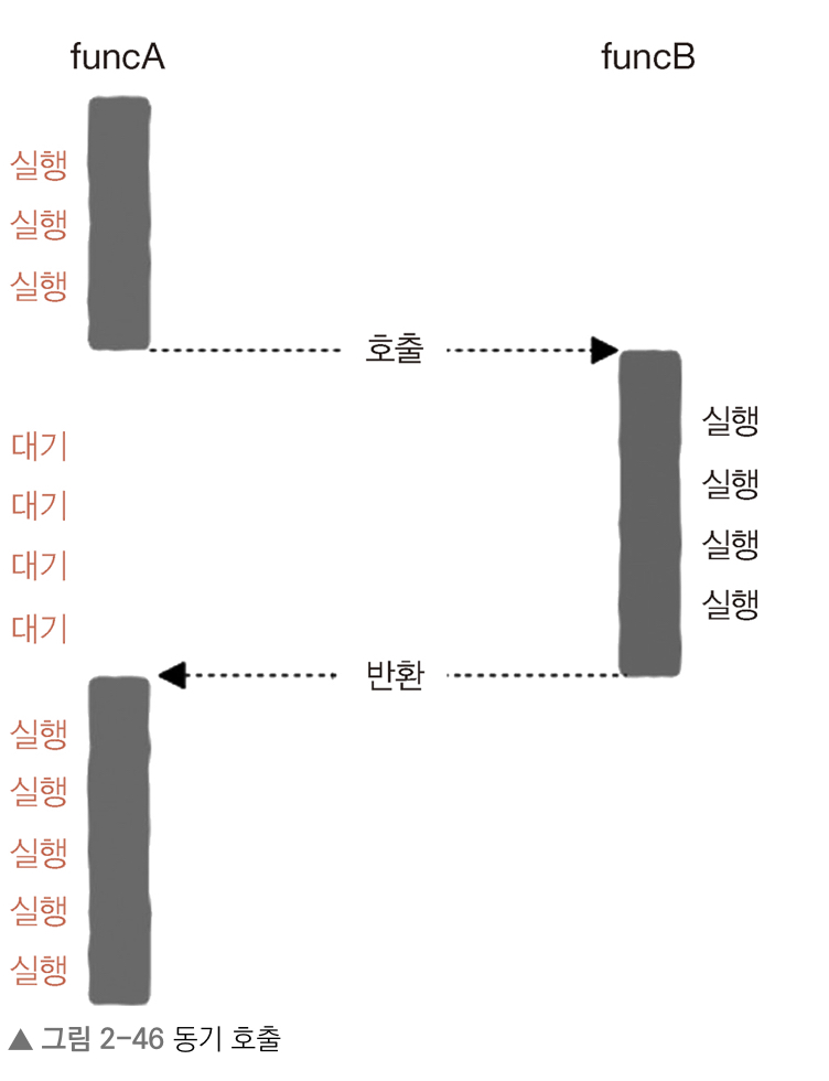 funcA() { // funcB 함수가 완료될 때까지 기다린다. funcB(); ... }- funcA 함수가 funcB 함수를 호출하면, funcB 함수 실행이 완료될 때까지 funcA 함수의 나머지 코드는 실행되지 않음