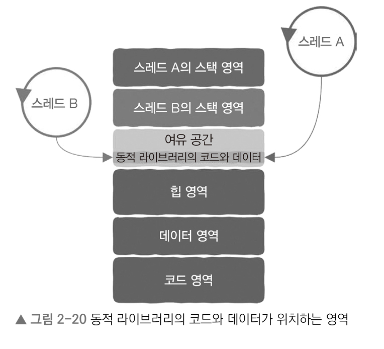 - 주소 공간에서 해당 부분은 모든 스레드가 공유하므로, 프로세스 내 모든 스레드가 동적 라이브러리 코드의 데이터를 사용할 수 있음