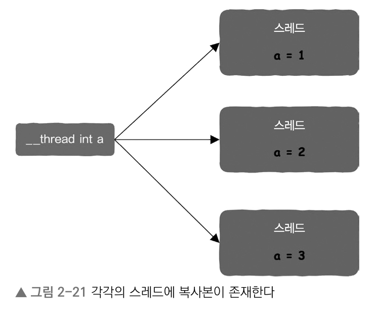 __thread int a = 1; // 스레드 전용 저장소- 전역 변수 a 앞에 __thread 수식어를 붙여 컴파일러가 전역 변수 a를 스레드 전용 저장소에 넣도록 지시하는 것