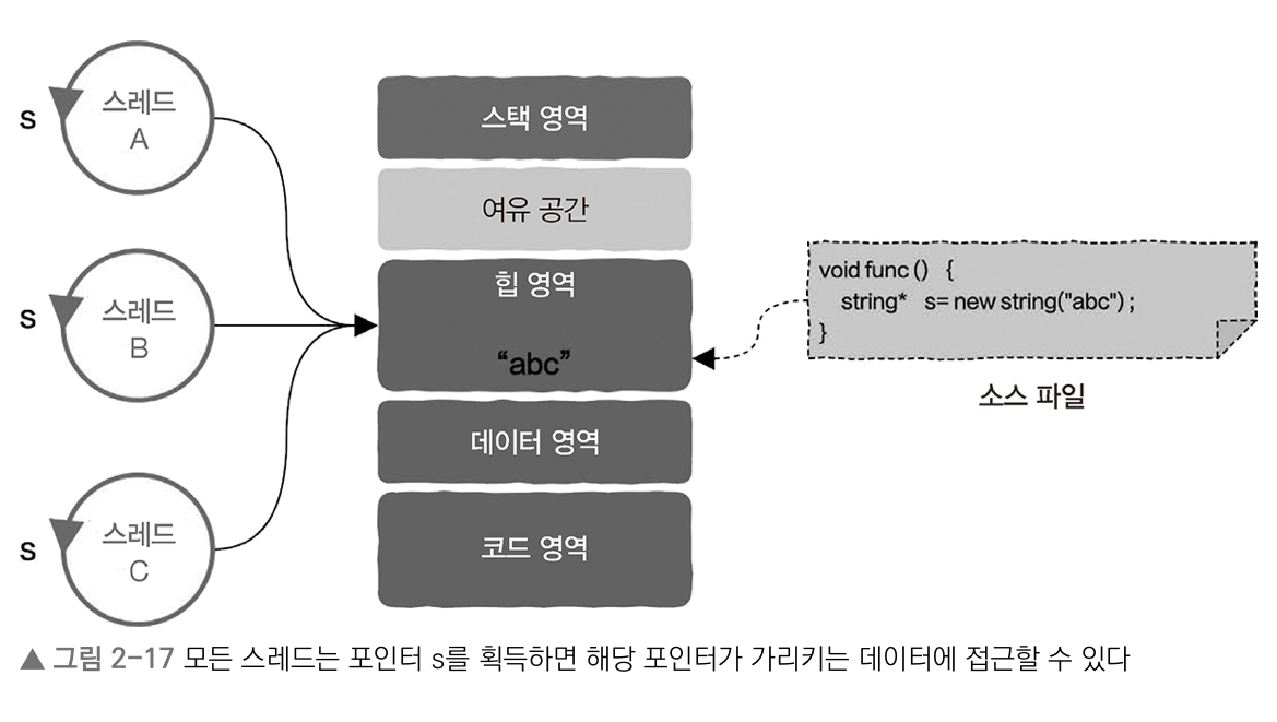 - 모든 스레드는 (해당 메모리 주소를 가리키는) 포인터를 얻을 수 있다면 포인터가 가리키는 데이터에 접근할 수 있음