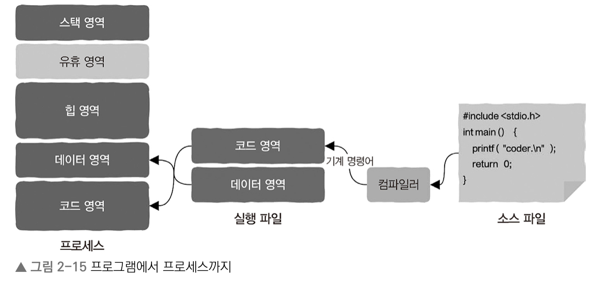 - 프로세스 주소 공간의 코드 영역에는 프로그래머가 작성한 코드를 컴파일한 후 생성된 실행 가능한 기계 명령어가 저장됨