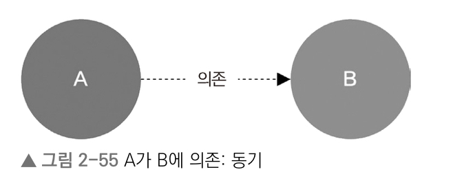 - 위와 같이 작업 A가 작업 B에 의존하는 경우 A와 B는 동기