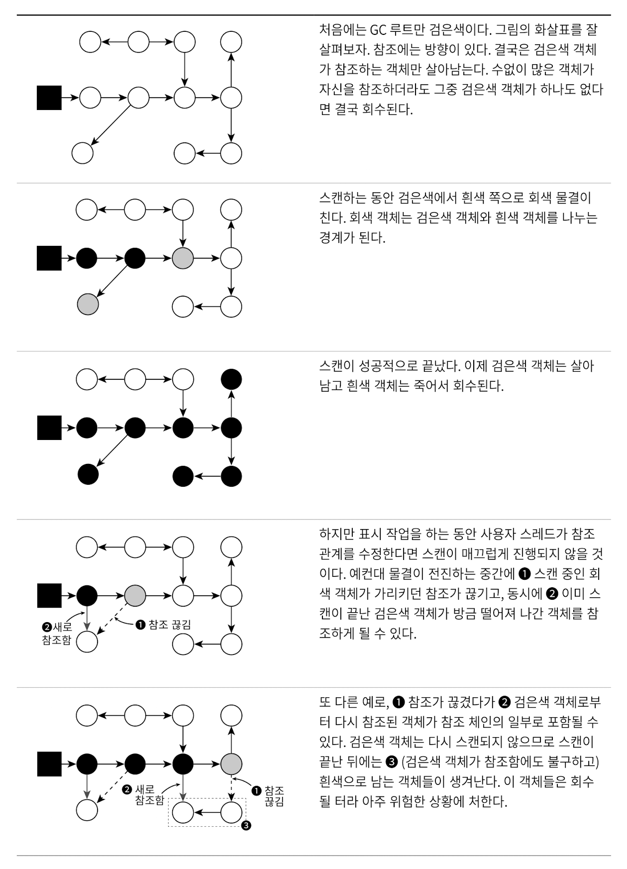 - 컬렉터가 객체 그래프에 색을 칠해 가는 도중에 사용자 스레드가 참조 관계를 변경할 수 있음