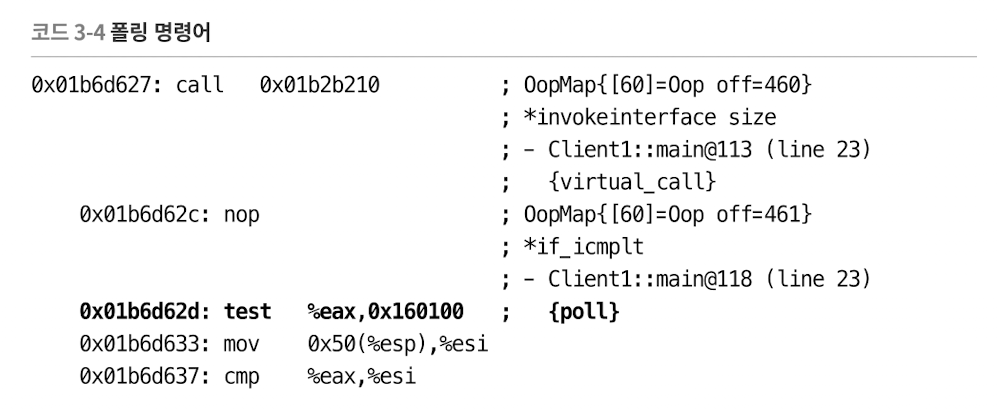 - 이런 식으로 안전 지점 폴링과 스레드 인터럽트 단 하나의 어셈블리 명령어(test)로 처리함