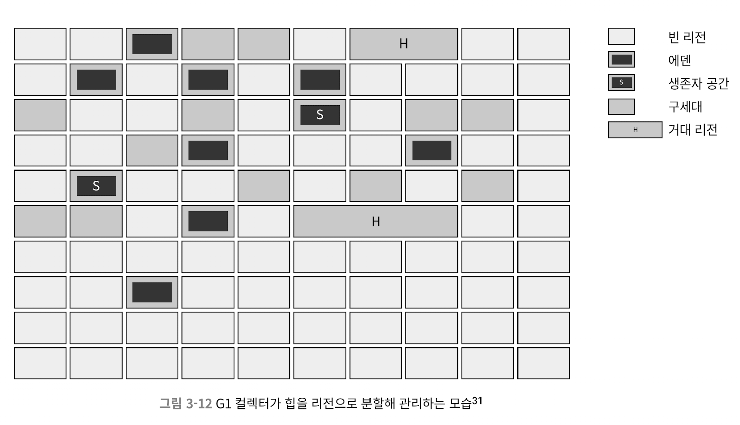 - '큰' 객체를 저장하기 위해 거대 리전(humongous region)이라는 특별한 유형도 활용함