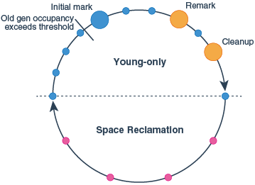 - Minor GC가 여러 번 반복 수행되다가 Old 영역이 일정 임계치를 초과하면 Mixed GC를 위한 준비 단계들이 수행됨