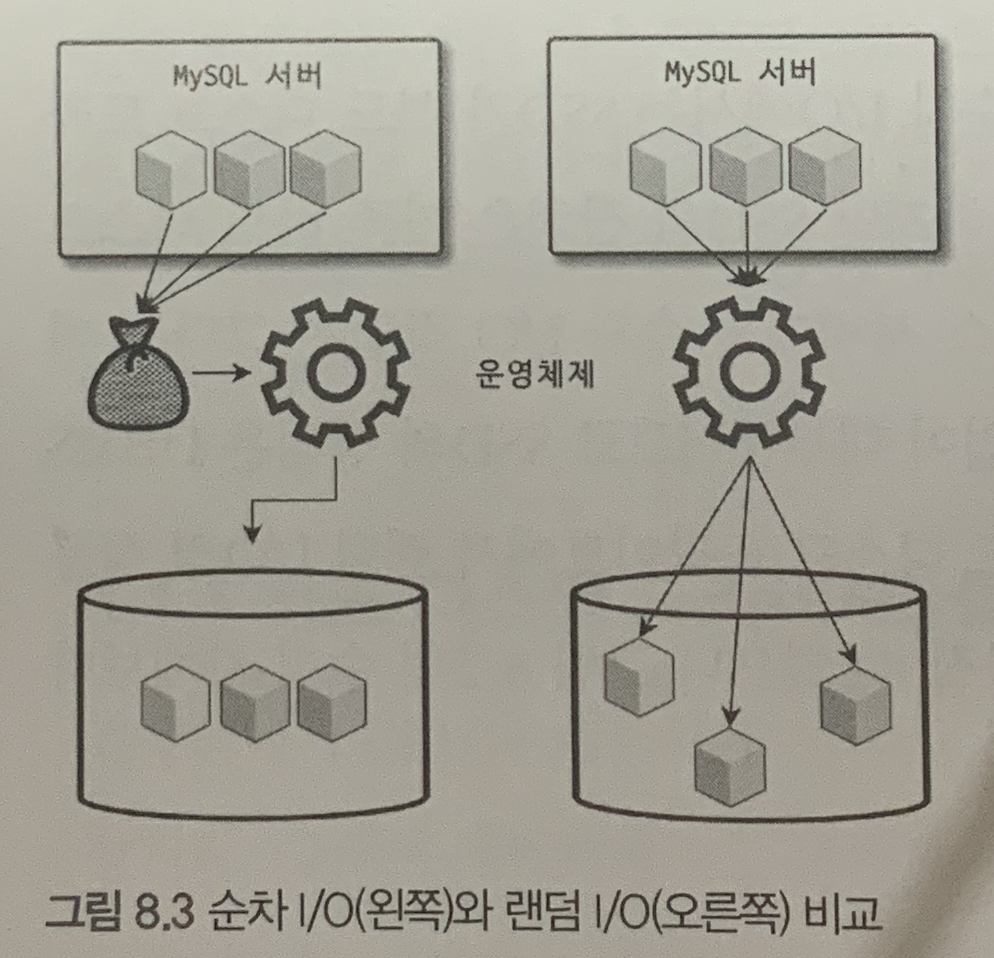 - 데이터베이스 대부분의 작업은 이러한 작은 데이터를 빈번히 읽고 쓰는 것이기 때문에 MySQL 서버에서는 그룹 커밋, 바이너리 로그 버퍼, InnoDB 로그 버퍼 등의 기능이 내장되어 있음