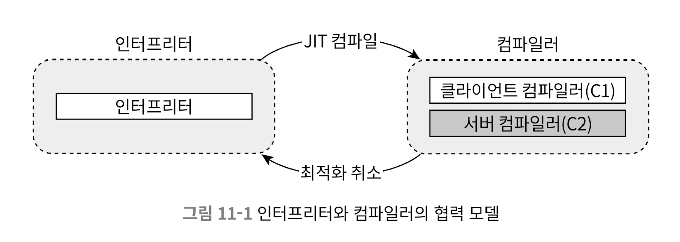 - 기본적으로 가상 머신의 실행 엔진은 컴파일이 완료될 때까지는 계속해서 인터프리터로 실행함