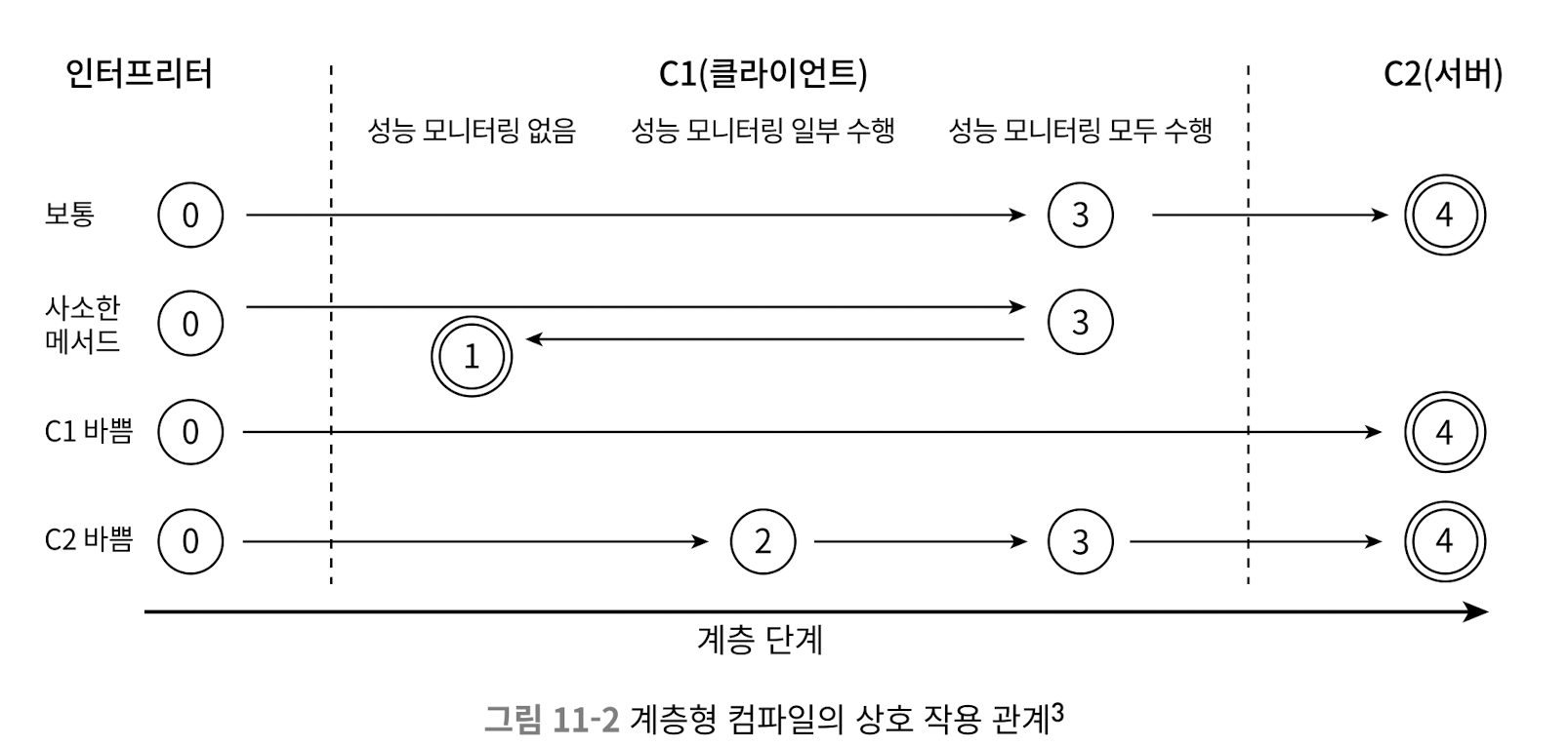 - 계층형 컴파일은 컴파일과 최적화 규모와 소요 시간에 따라 다음과 같이 여러 단계의 수준으로 수행됨