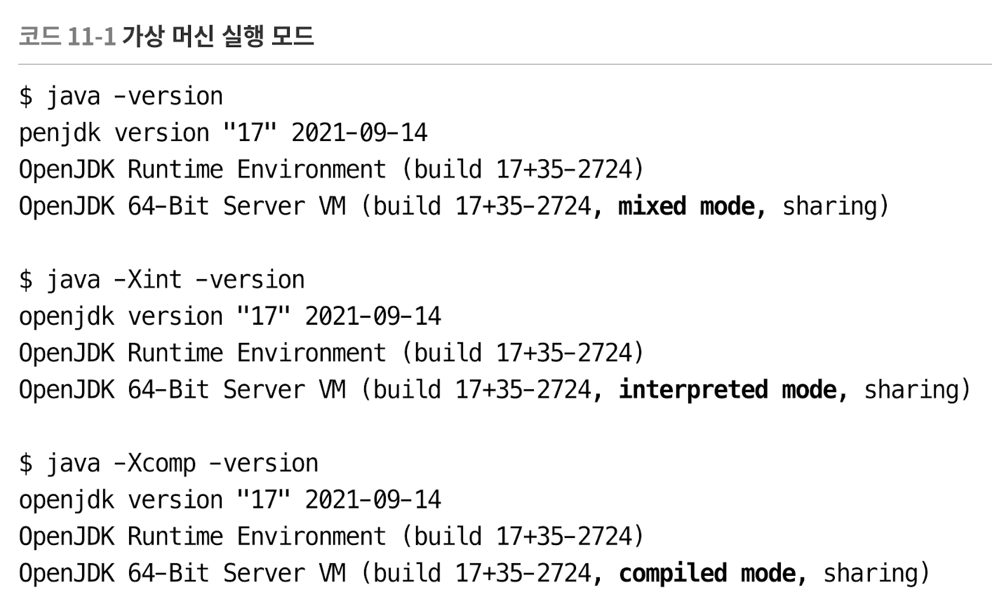 - -Xint 매개 변수 지정하여 가상 머신을 '해석 모드'로 고정하거나, -Xcomp 매개 변수 지정하여 '컴파일 모드'로 고정할 수 있음