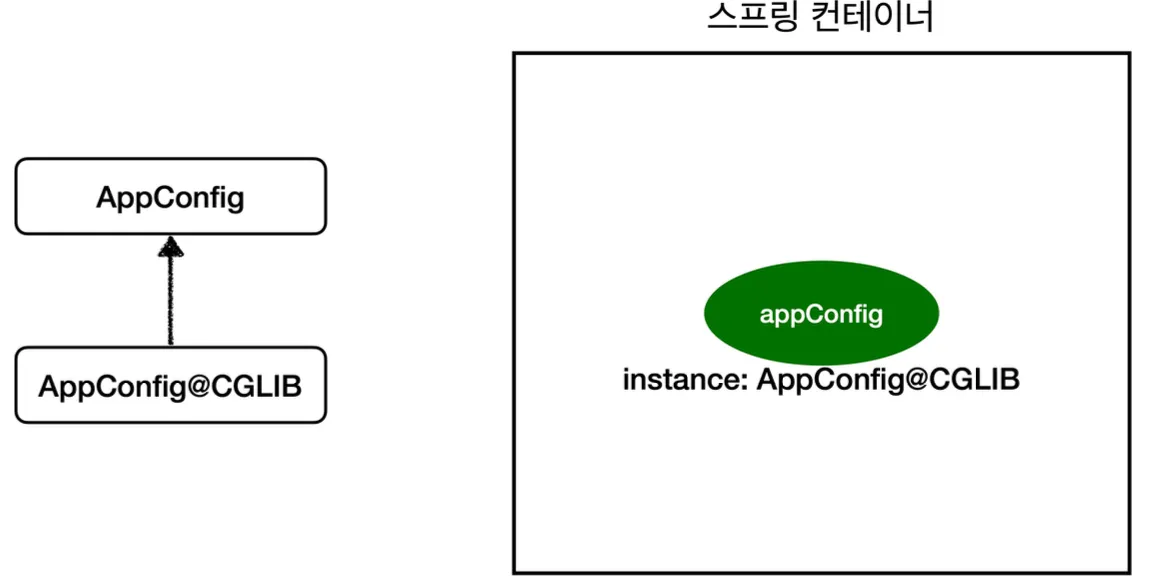 - CGLIB를 사용해 AppConfig Bean 생성 시 위와 같이 (AppConfig 클래스를 상속한) 하위 클래스 객체를 생성함