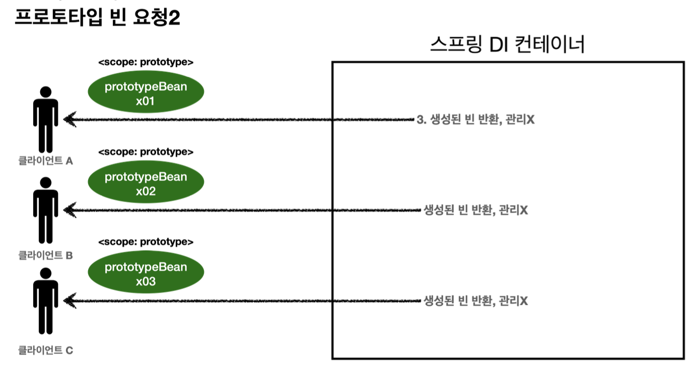 - 스프링 컨테이너는 새롭게 생성한 프로토타입 빈을 클라이언트에 반환한다. (이후 더이상 스프링 컨테이너가 관리하지 않음)