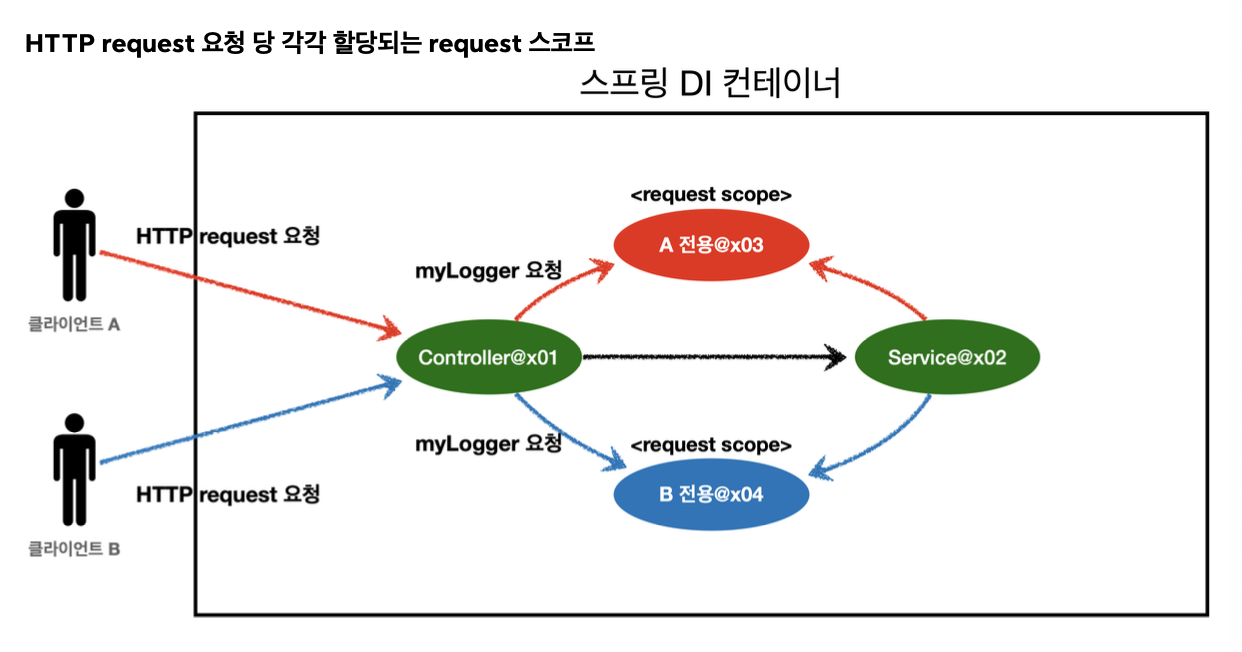 - 각각의 HTTP 요청마다 별도의 빈 인스턴스가 생성되고, 관리됨
