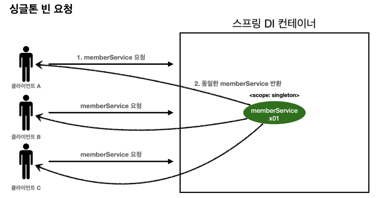 - 이후에 스프링 컨테이너에 같은 요청이 와도 동일한 객체 인스턴스의 스프링 빈을 반환한다.