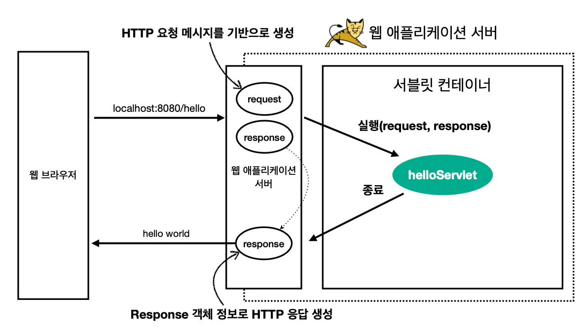 - HTTP 요청 시 WAS는 Request와 Response 객체를 새로 만들어서 서블릿 컨테이너 내 서블릿 객체를 호출함