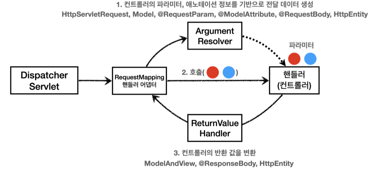 - 어노테이션 기반 컨트롤러를 처리하는 RequestMappingHandlerAdapter는 ArgumentResolver를 호출해서 컨트롤러(핸들러)가 필요로 하는 다양한 파라미터의 값(객체)을 생성하고, 파라미터의 값이 모두 준비되면 컨트롤러를 호출하면서 값을 넘겨줌